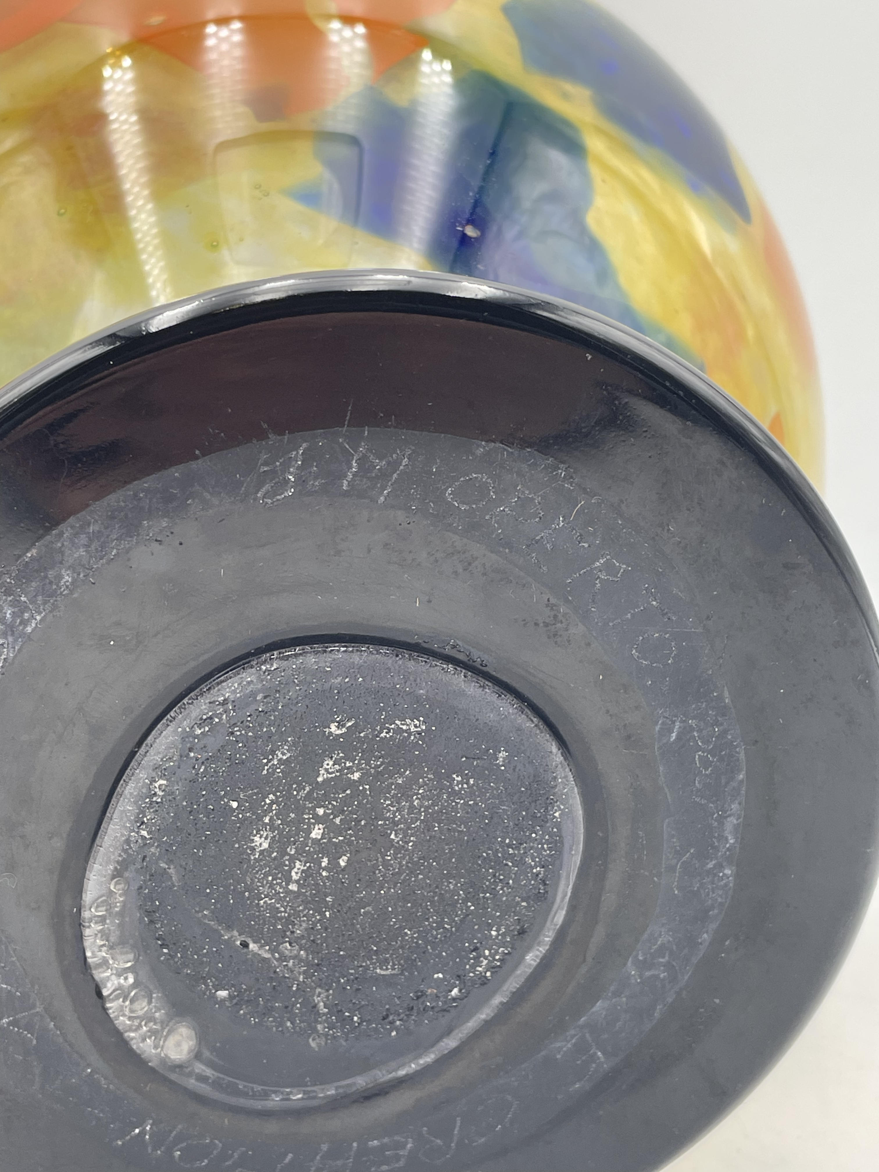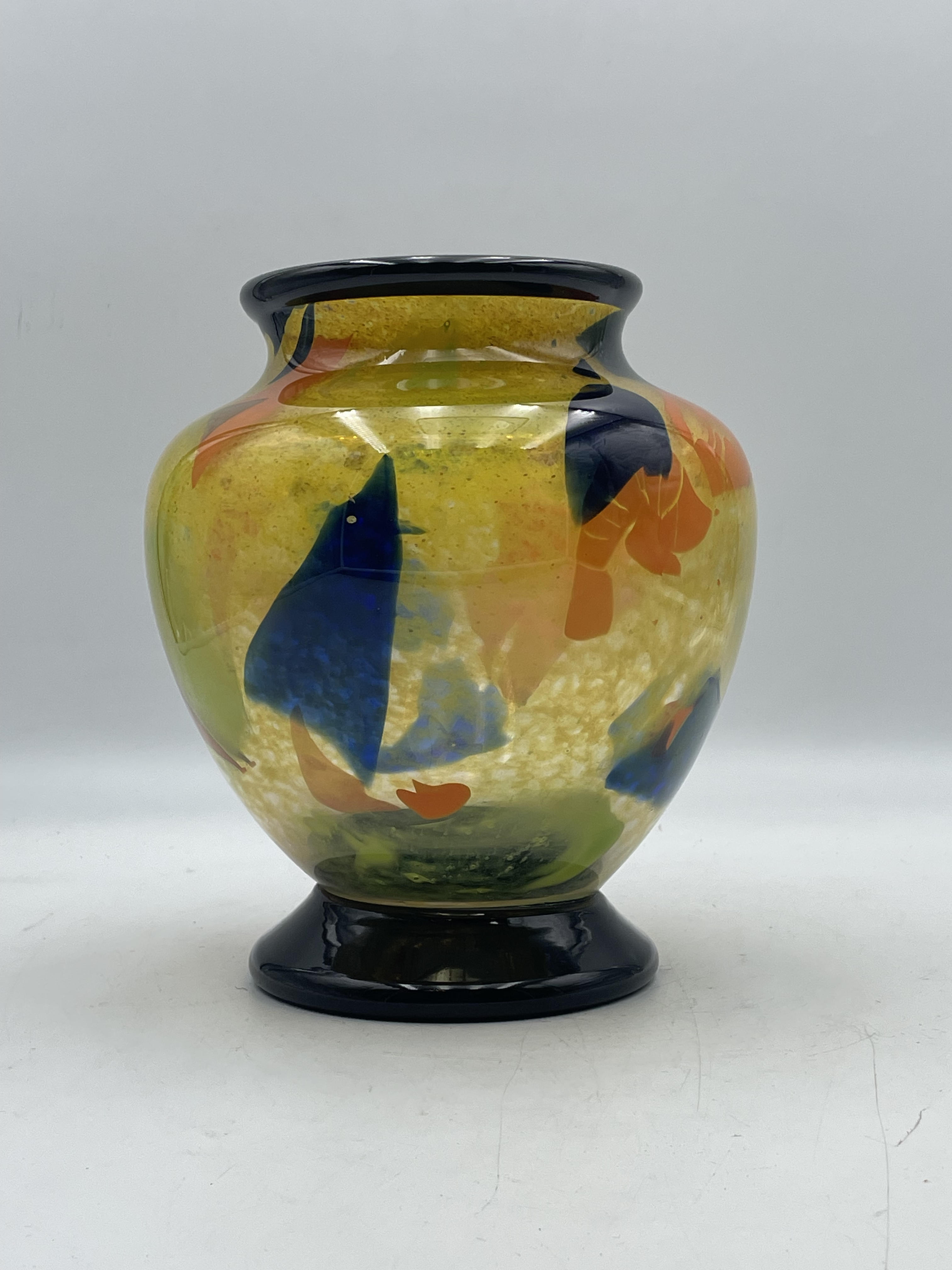 Vase en verre à inclusion orange et bleu signé daté 97
